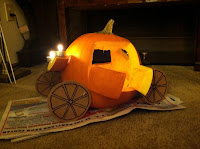 Naturally, I planned what I’d do as I drove to the store, which was the stop I made on the way to the party. I had two ideas: Cinderella’s Coach or a house (as I have made in the past). I found a sufficiently round pumpkin, so I went with the coach. I am SO glad Blaine is an artist, because I had to ask him for supplies I hadn’t thought about. Of course he had them.I was pleased with the way the coach turned out, even if it didn’t look as professional as all the pumpkins that had been carved using stencils - for something done on the fly, I was happy with it.